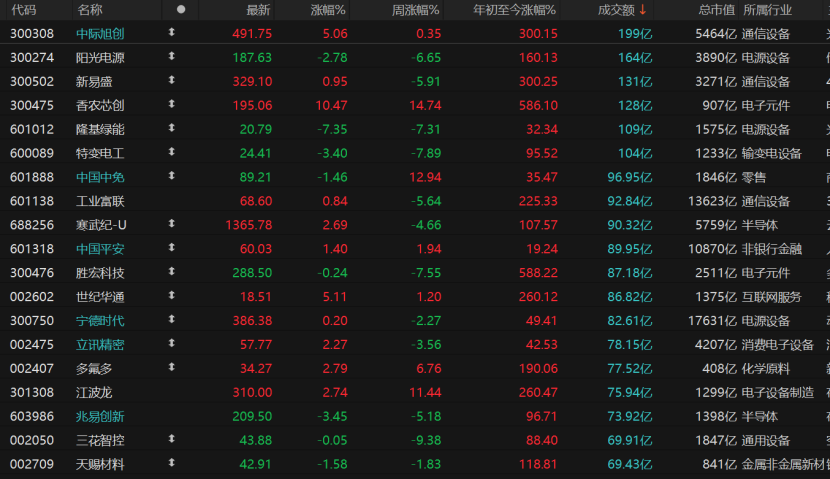 市场共计1758只个股收涨,涨停股77只;3563只个股收跌,跌停股10只。6只个股日成交额超过100亿元,中际旭创涨逾5%,新易盛涨约1%,香农芯创涨幅超过10%。但阳光电源跌近3%,隆基绿能跌逾7%,特变电工继续回调。