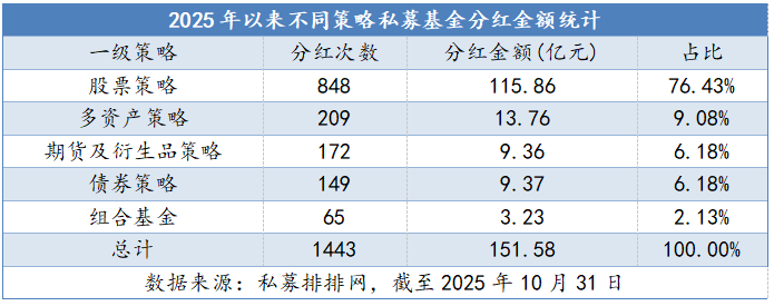从策略类型看,股票策略产品毫无悬念地成为分红主力。私募排排网数据显示,今年以来股票策略产品合计分红848次,分红金额达115.86亿元,占分红总额的76.43%,远超其他策略类型。