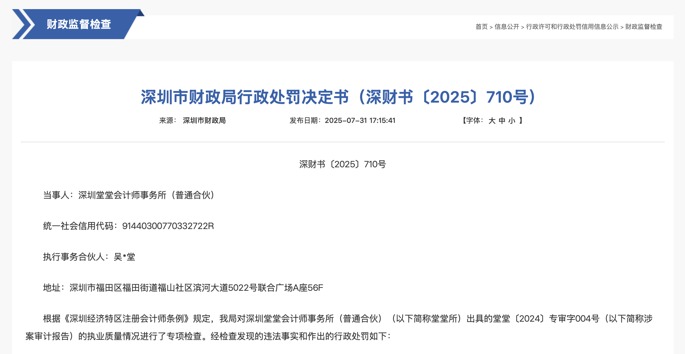 今年7月,深圳市财政局公布一则行政处罚决定,深圳堂堂会计师事务所(堂堂所)因在审计汇清高宝公司商品混凝土搅拌站项目时,未获取充分的审计证据,被予以警告。