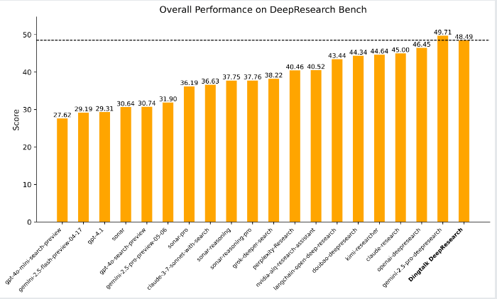 近日,由钉钉团队研发的深度研究系统“Dingtalk-DeepResearch”在国际权威评测中取得突破性成绩,在DeepResearch Bench测试中以48.49分位列全球第二、国内第一,超越OpenAI、Claude等主流系统。