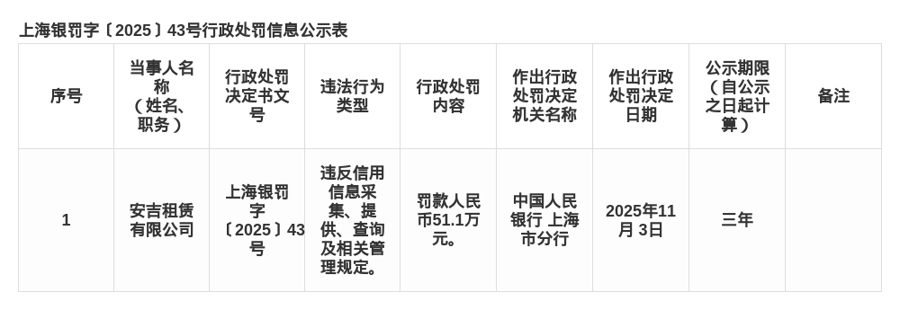 安吉租赁被罚51.1万,涉信用信息采集等违规