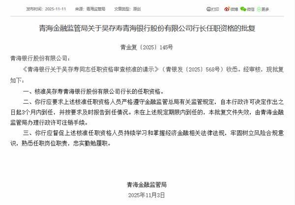中国网财经11月12日讯 11月11日,青海金融监管局公布相关批复显示,核准应海峰青海银行股份有限公司董事长的任职资格。另外一则批复显示,核准吴存寿青海银行股份有限公司行长的任职资格。
