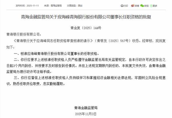 青海银行董事长应海峰、行长吴存寿任职资格获批