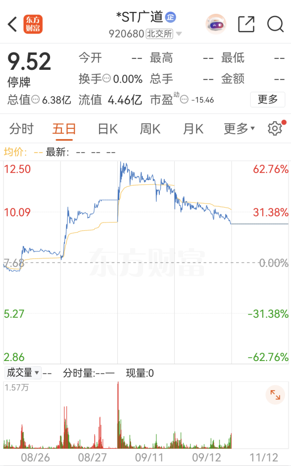 *ST广道自9月15日开市起停牌。截至9月12日收盘,*ST广道股价报9.52元/股,总市值为6.38亿元。