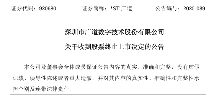 11月12日晚间,*ST广道(920680)公告称,公司当日收到北京证券交易所出具的《关于深圳市广道数字技术股份有限公司股票终止上市的决定》(简称《决定书》)。