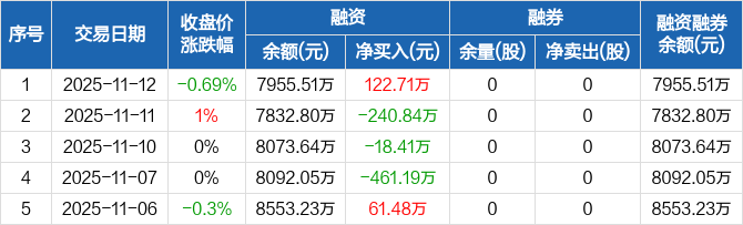 哈铁科技:融资净买入122.71万元,融资余额7955.51万元(11-12)