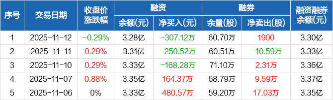 广州港融资融券信息显示,2025年11月12日融资净偿还307.12万元;融资余额3.28亿元,较前一日下降0.93%。