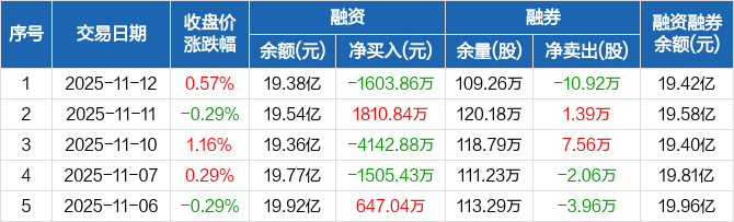 融资方面,当日融资买入1.81亿元,融资偿还1.97亿元,融资净偿还1603.86万元。融券方面,融券卖出6600股,融券偿还11.58万股,融券余量109.26万股,融券余额382.41万元。融资融券余额合计19.42亿元。