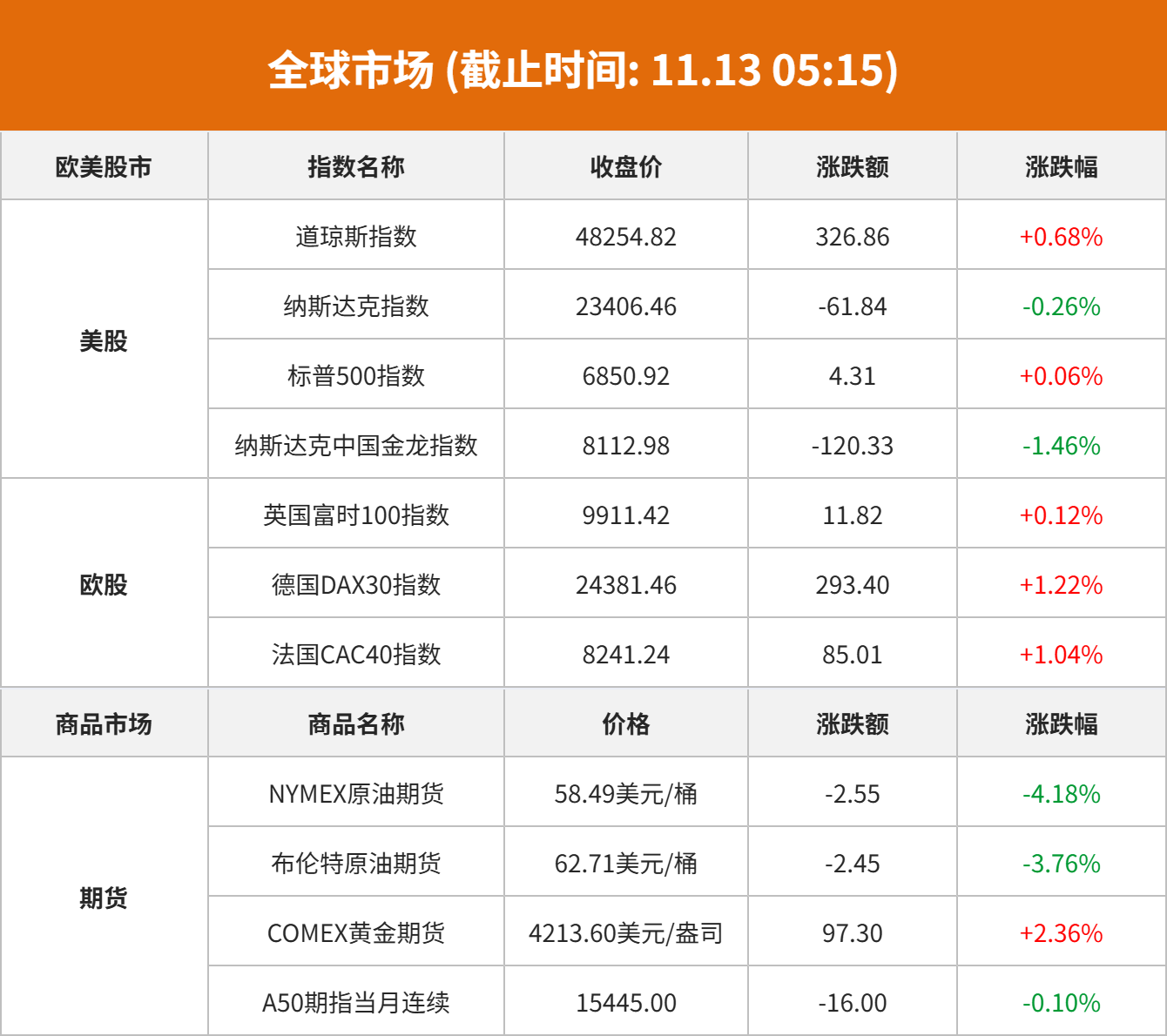 美股市场:美股三大指数11月12日收盘涨跌不一,道指续创收盘历史新高。截至收盘,道琼斯工业平均指数比前一交易日上涨326.86点,收于48254.82点,涨幅为0.68%;标准普尔500种股票指数上涨4.31点,收于6850.92点,涨幅为0.06%;纳斯达克综合指数下跌61.84点,收于23406.46点,跌幅为0.26%。