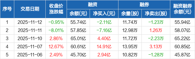 天孚通信融资融券信息显示,2025年11月12日融资净偿还2.11亿元;融资余额55.74亿元,较前一日下降3.64%