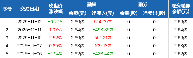 融资方面,当日融资买入1338.58万元,融资偿还823.59万元,融资净买入514.99万元。融券方面,融券卖出0股,融券偿还0股,融券余量0股,融券余额0元。融资融券余额合计2.69亿元。