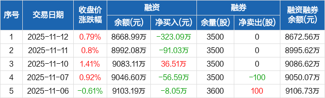 融资方面,当日融资买入314.46万元,融资偿还637.55万元,融资净偿还323.09万元。融券方面,融券卖出0股,融券偿还0股,融券余量3500股,融券余额3.57万元。融资融券余额合计8672.56万元。