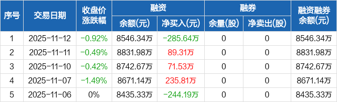 融资方面,当日融资买入334.92万元,融资偿还620.56万元,融资净偿还285.64万元。融券方面,融券卖出0股,融券偿还0股,融券余量0股,融券余额0元。融资融券余额合计8546.34万元。