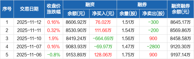 敷尔佳融资融券信息显示,2025年11月12日融资净买入76.02万元;融资余额8606.92万元,较前一日增加0.89%