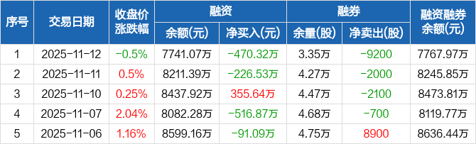 华润材料:融资净偿还470.32万元,融资余额7741.07万元(11-12)