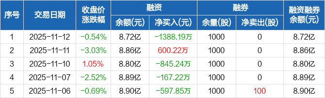 融资方面,当日融资买入1038.89万元,融资偿还2427.08万元,融资净偿还1388.19万元。融券方面,融券卖出0股,融券偿还0股,融券余量1000股,融券余额2.04万元。融资融券余额合计8.72亿元。