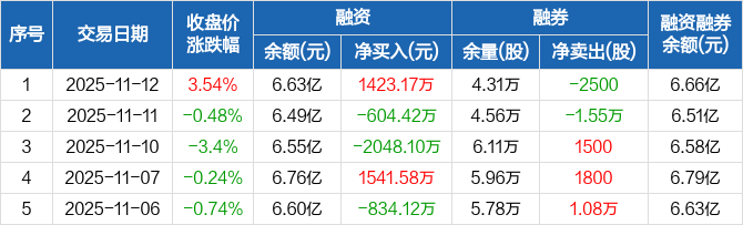 融资方面,当日融资买入1.05亿元,融资偿还9075.48万元,融资净买入1423.17万元。融券方面,融券卖出1300股,融券偿还3800股,融券余量4.31万股,融券余额213.22万元。融资融券余额合计6.66亿元。