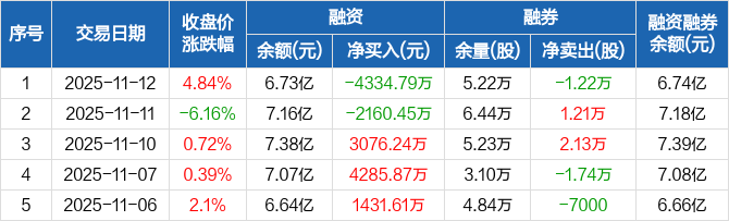融资方面,当日融资买入1.3亿元,融资偿还1.74亿元,融资净偿还4334.79万元。融券方面,融券卖出4800股,融券偿还1.7万股,融券余量5.22万股,融券余额171.84万元。融资融券余额合计6.74亿元。