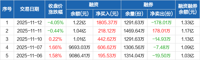 融资方面,当日融资买入5430.71万元,融资偿还3625.33万元,融资净买入1805.37万元,连续5日净买入累计3268.27万元。融券方面,融券卖出0份,融券偿还178.01万份,融券余量1291.63万份,融券余额1132.76万元。融资融券余额合计1.33亿元。