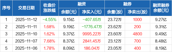 中伟股份融资融券信息显示,2025年11月12日融资净偿还407.65万元;融资余额9.15亿元,较前一日下降0.44%