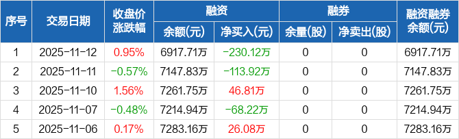 融资方面,当日融资买入335.59万元,融资偿还565.7万元,融资净偿还230.12万元。融券方面,融券卖出0股,融券偿还0股,融券余量0股,融券余额0元。融资融券余额合计6917.71万元。