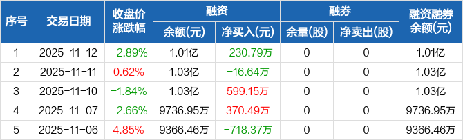 盛德鑫泰融资融券信息显示,2025年11月12日融资净偿还230.79万元;融资余额1.01亿元,较前一日下降2.24%
