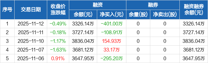 智迪科技:融资净偿还401万元,融资余额3326.14万元(11-12)