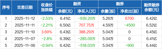 融资方面,当日融资买入3778.98万元,融资偿还4718.17万元,融资净偿还939.2万元。融券方面,融券卖出8800股,融券偿还2100股,融券余量5.26万股,融券余额133.76万元。融资融券余额合计6.42亿元。
