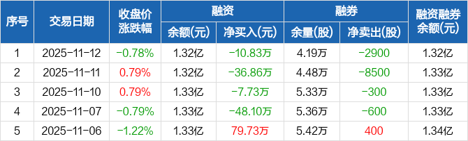 融资方面,当日融资买入478.72万元,融资偿还489.55万元,融资净偿还10.83万元,连续4日净偿还累计103.51万元。融券方面,融券卖出0股,融券偿还2900股,融券余量4.19万股,融券余额37.21万元。融资融券余额合计1.32亿元。