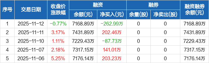 恒光股份:融资净偿还262.99万元,融资余额7168.89万元(11-12)