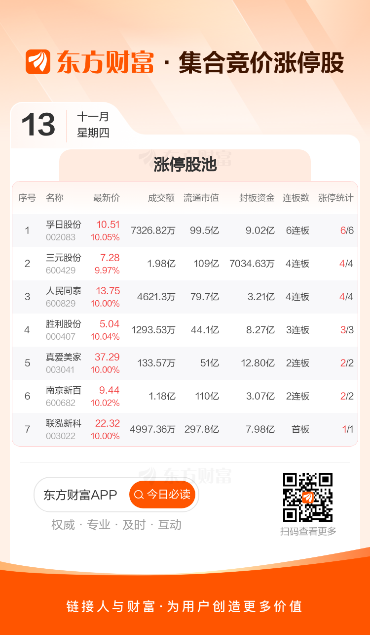 11月13日集合竞价:孚日股份6连板 三元股份4连板