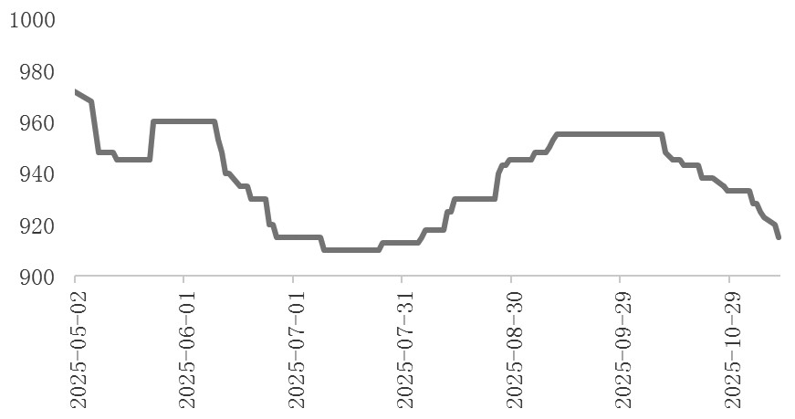 进入10月,“金九”传统旺季的需求不及预期,在下游订单情况不佳的背景下,钢厂降价采购各类原料,不锈钢成本支撑逐步下移。镍生铁方面,印尼镍生铁具有显著的成本优势,已成为全球镍生铁的主要供应国。2025年9月,我国从印尼进口镍生铁105.5万实物吨,环比增加24.2%,同比增加47.8%。由于供应较充裕且钢厂压价采购,镍生铁价格持续下跌,近期华东某钢厂采购成交价为905元/镍(到厂含税),成交2000吨。高碳铬铁方面,11月青山和太钢两大钢厂的高碳铬铁招标价与上月持平,但不锈钢价格表现偏弱导致市场信心不足,高碳铬铁主产区现货价格降至8200元/50基吨。