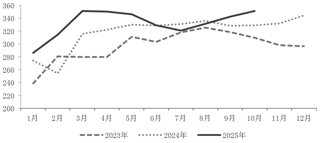 供应方面,作为不锈钢主流系别的304系在当前利润情况下减产动力不足,不锈钢整体供应处于高位。根据钢联数据,2025年10月国内43家不锈钢厂粗钢产量为351.38万吨,11月排产量为345.51万吨,环比减少1.67%,同比增加4.12%。