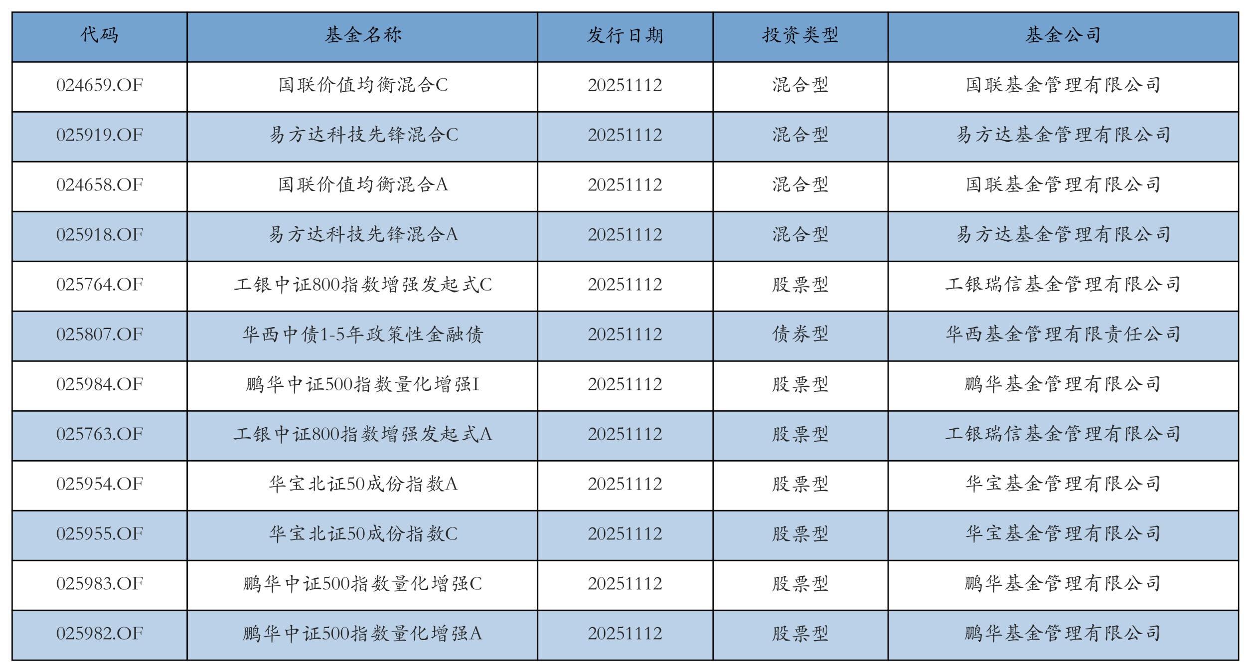 昨日有12只新基金发行,分别为:国联价值均衡混合C、易方达科技先锋混合C、国联价值均衡混合A、易方达科技先锋混合A、工银中证800指数增强发起式C、华西中债1-5年政策性金融债、鹏华中证500指数量化增强I、工银中证800指数增强发起式A、华宝北证50成份指数A、华宝北证50成份指数C、鹏华中证500指数量化增强C、鹏华中证500指数量化增强A,详情见下表:
