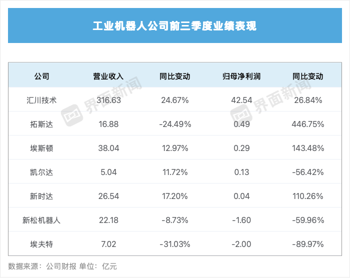 其中,埃夫特(688165.SH)与新松机器人(300024.SZ)营业收入均出现下滑,且均处于亏损状态。
