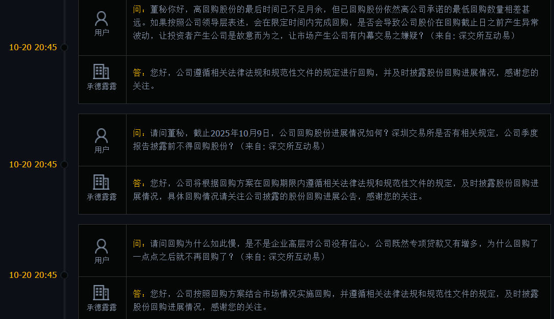 其中承德露露的回购节奏明显呈现“前松后紧”的特点。公司已于11月7日完成本次回购,但回溯过程可见明显的节奏波动:去年10月披露预案,拟回购3000万股~6000万股,金额不超7.05亿元;今年1月启动后,截至2月底完成300万股回购,支付金额2582.89万元,随后回购事项持续停滞半年时间,直至9月底,距离11月10日截止日期仅剩月余,实际回购量仅达下限的1/10,引发投资者在互动平台多次“催进度”。