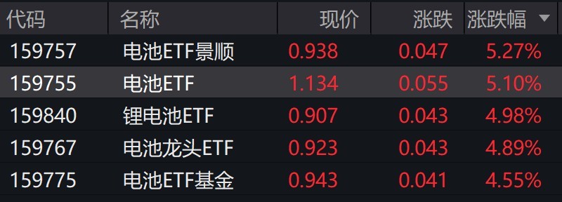 受盘面影响,电池相关ETF涨约5%。