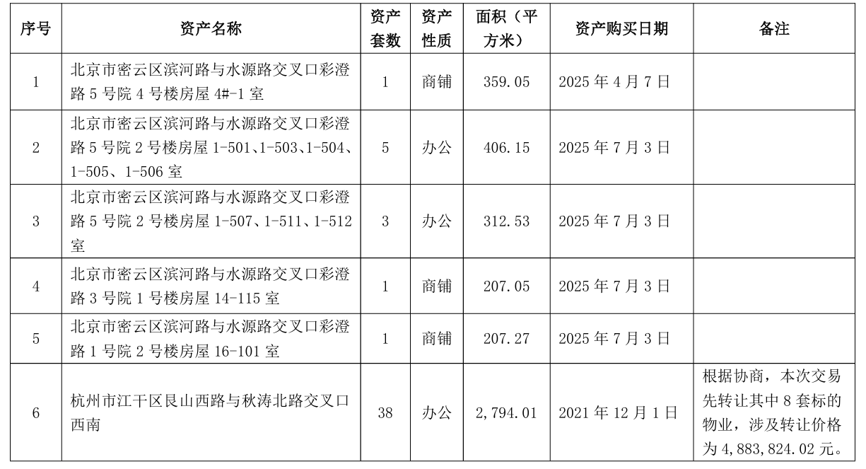 值得注意的是,交易标的中,北京市密云区滨河路与水源路交叉口彩澄路3号院1号楼房屋14-115室、北京市密云区滨河路与水源路交叉口彩澄路5号院2号楼房屋1-507、1-511、1-512室等购买日期为2025年7月3日。换言之,东方雨虹购入上述资产不足5个月便急于出手。