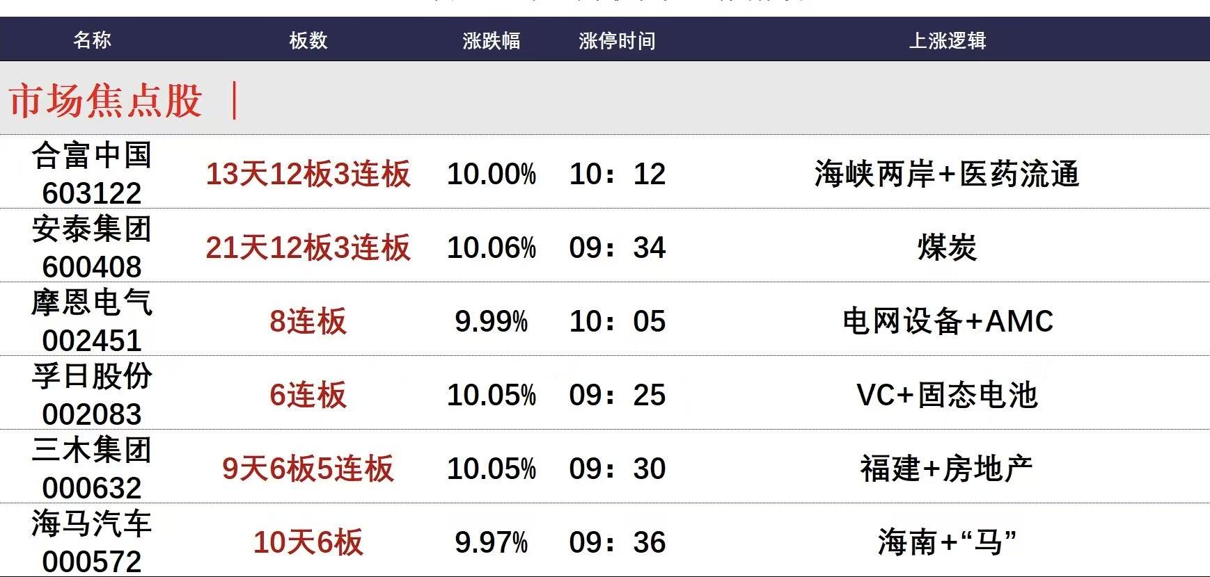 今日午盘全市场共66股涨停,连板股总数17只,26股封板未遂,封板率为72%(不含ST股、退市股)。焦点股方面,炒“地图”行情火热,合富中国走出13天12板,三木集团9天6板,海马汽车反包涨停录得10天6板。锂电池板块全线爆发,孚日股份一字涨停晋级6连板,国城矿业4天3板。