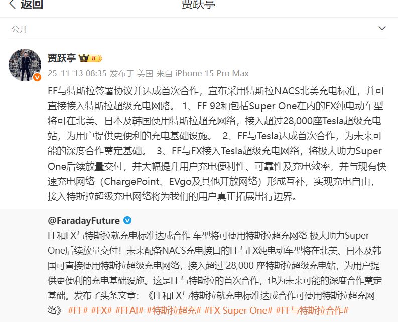 11月13日上午,法法创始人、合伙人、首席产品及用户生态官,LeEco乐视创始人贾跃亭在微博发文称,Faraday Future(以下简称“FF”)与特斯拉签署协议并达成首次合作