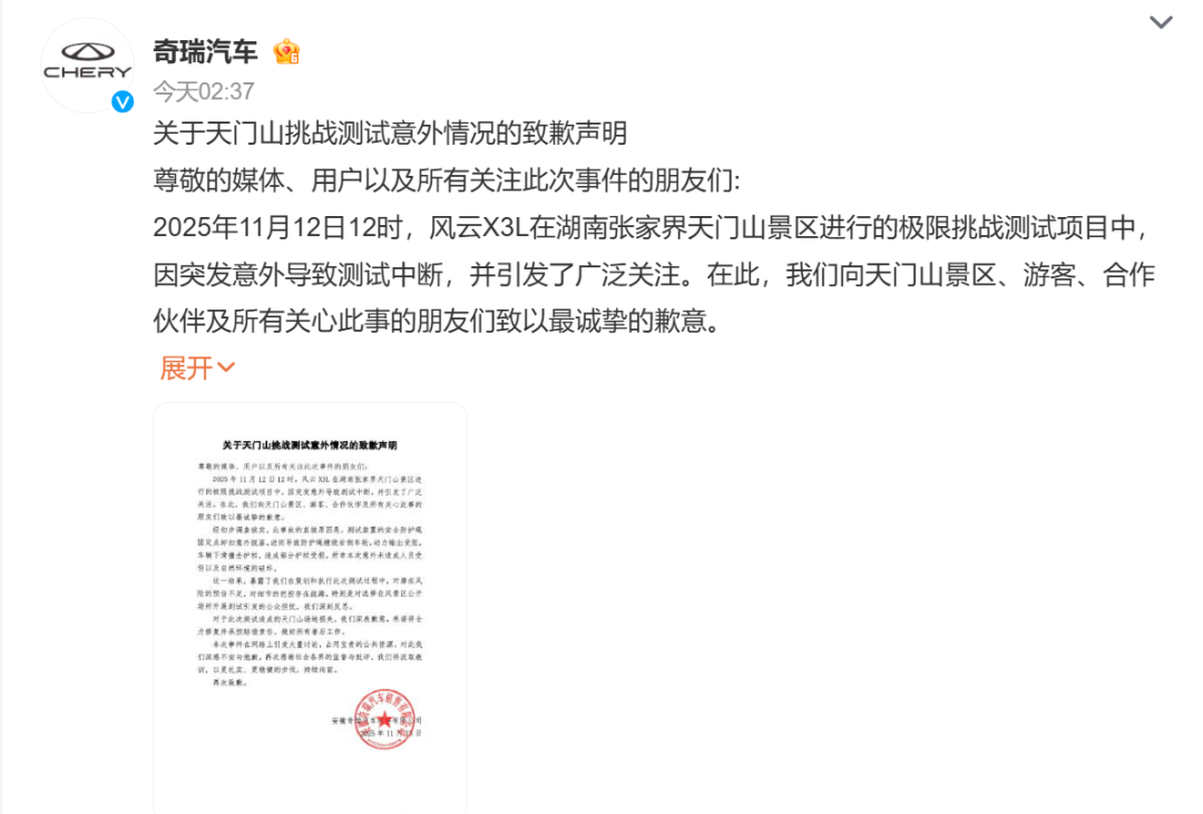 奇瑞汽车称,2025年11月12日12时,风云X3L在湖南张家界天门山景区进行的极限挑战测试项目中,因突发意外导致测试中断,并引发了广泛关注。“在此,我们向天门山景区、游客、合作伙伴及所有关心此事的朋友们致以最诚挚的歉意。”