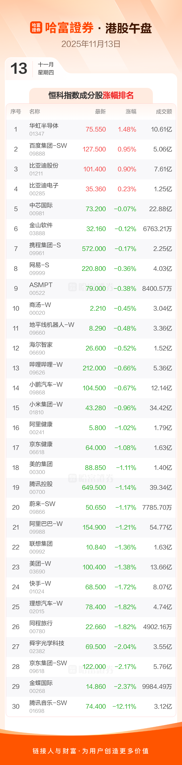 港股11月13日午盘走低 ,恒生指数收报26766.71点,跌156.02点,跌幅0.58%;恒生科技指数收报5888.39点,跌45.6点,跌幅0.77%。恒生指数成分股中中国生物制药、石药集团、紫金矿业涨幅居前,华润万象生活、中国海洋石油、九龙仓置业跌幅靠前。恒生科技指数成分股中华虹半导体、百度集团-SW、比亚迪股份涨幅居前,腾讯音乐-SW、金蝶国际、京东集团-SW跌幅靠前。