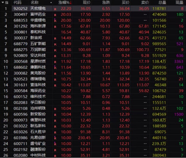 11月13日早盘,最靓的仔无疑就是锂电池,华盛锂电、泰和科技、新宙邦、海科新源、孚日股份等全线飙涨。值得一提的是,涨停及涨幅超过10%的个股一度达到30只。