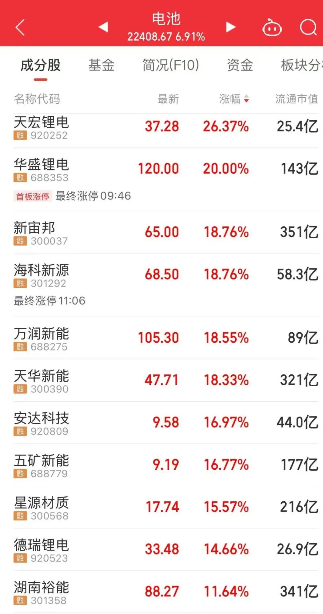 今天上午,电池板块大涨,天宏锂电、新宙邦、海科新源等个股大涨,华盛锂电“20CM”涨停。