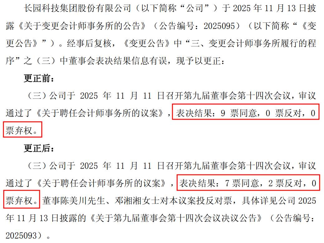 颇为讽刺的是,11月12日晚间,ST长园前后发布“关于变更会计师事务所的公告”和“关于变更会计师事务所的更正公告”,更正前是“9票同意,0票反对,0票弃权”,更正后为“7票同意,2票反对,0票弃权”: