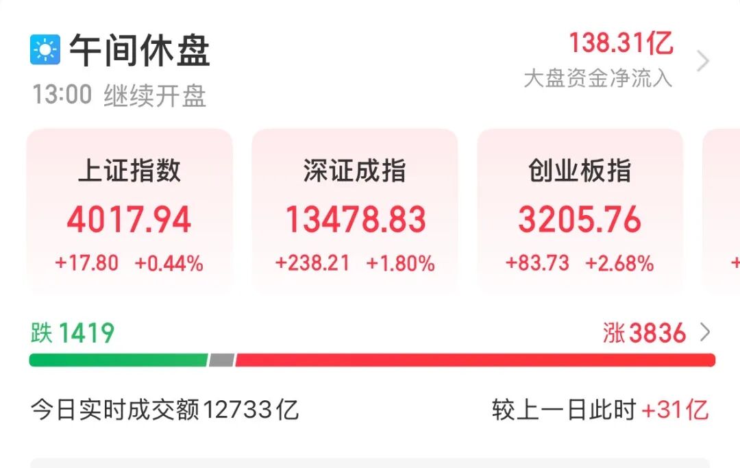 11月13日上午,A股三大指数震荡走强,权重股宁德时代大涨8%,带动创业板指拉升超2%。截至午间收盘,上证指数报4017.94点,涨0.44%;深证成指报13478.83点,涨1.80%;创业板指报3205.76点,涨2.68%。沪深北三市半日成交12733亿元。