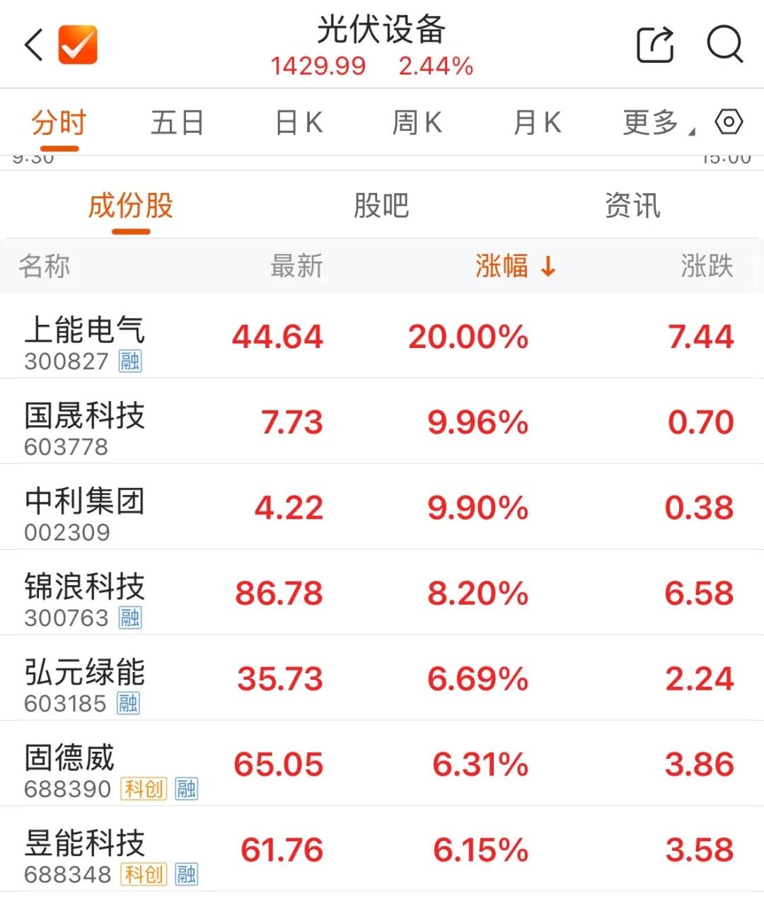 光伏概念股今日盘中强势拉升,上能电气以20%幅度涨停,联泓新科、国晟科技等涨停。