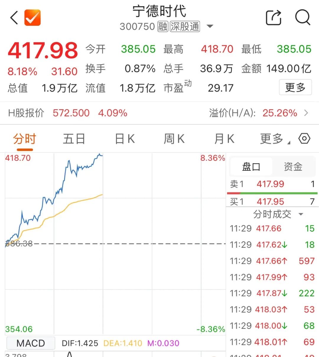 宁德时代AH股早盘联袂走高,截至午间收盘,宁德时代A股报417.98元/股,涨8.18%,总市值1.91万亿元,成交额149亿元,位居A股第一。宁德时代H股盘中涨近6%,股价最高报582港元/股。11月12日晚,海博思创披露,公司当天与宁德时代在福建省宁德市以书面方式签署了《战略合作协议》。(详见:688411“抢”电池!3年不低于200GWh!)