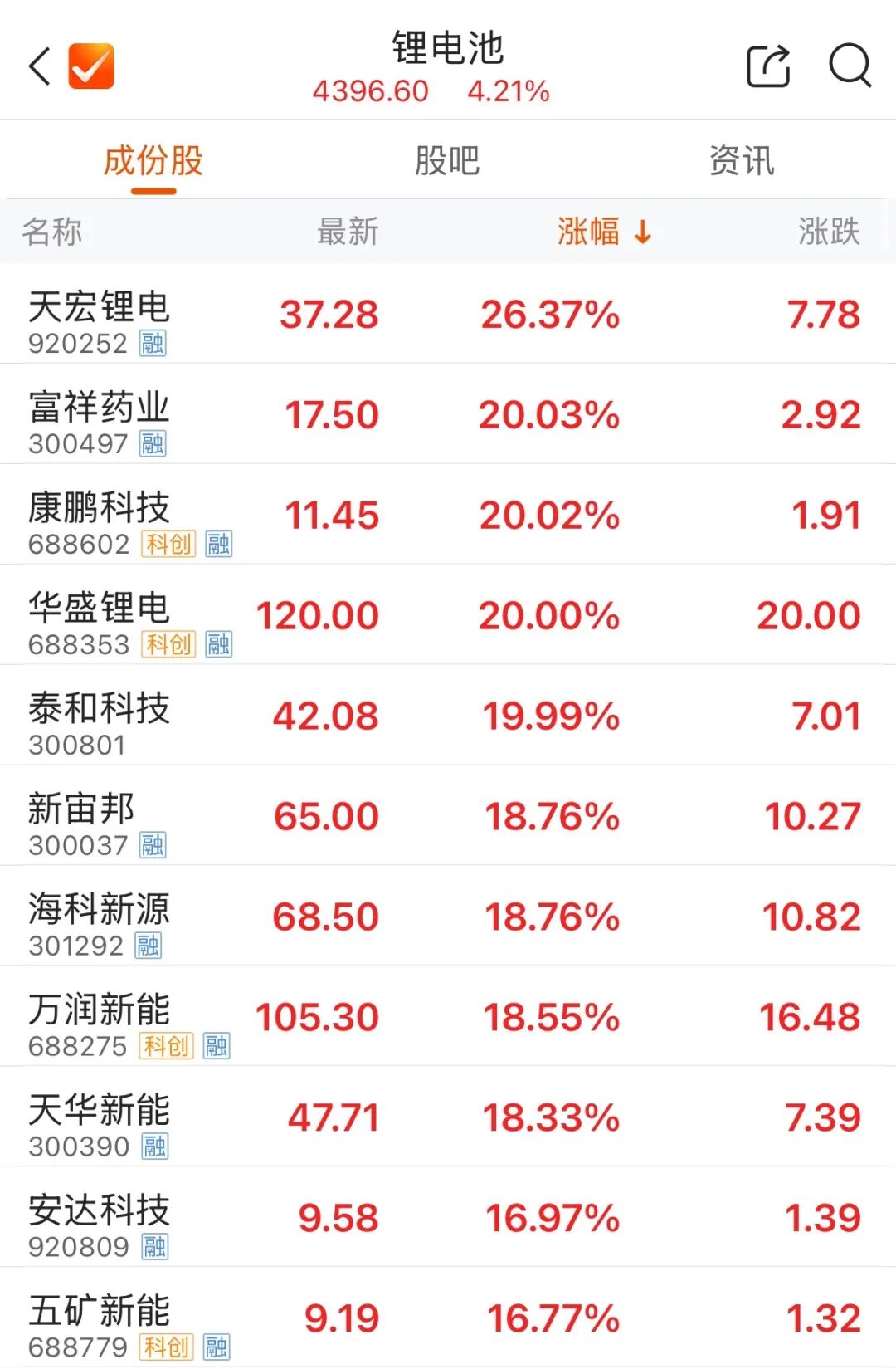 早盘,锂电池产业链点燃市场热情,华盛锂电收获20%幅度涨停,股价创新高,康鹏科技、泰和科技、永兴材料、天赐材料等20余只个股涨停。