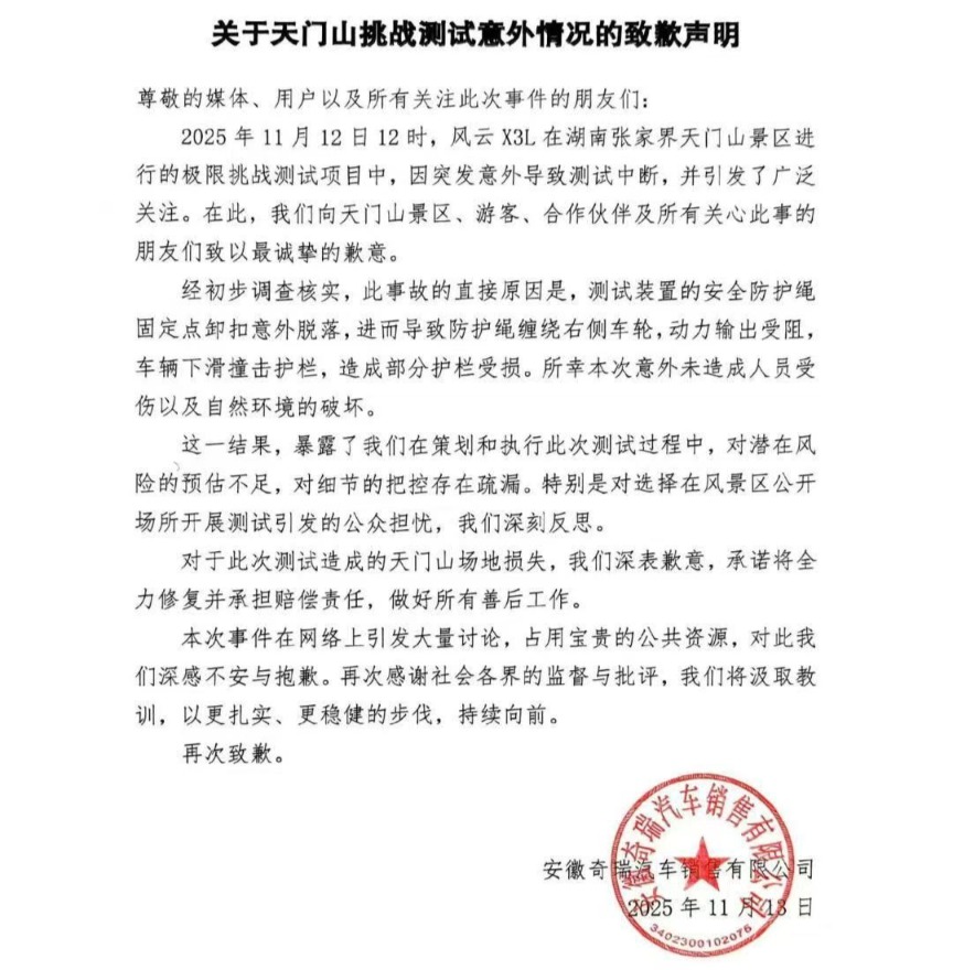 11月13日凌晨2:37,安徽奇瑞汽车销售有限公司(以下简称奇瑞汽车)发布声明称,11月12日12时,风云X3L在湖南张家界天门山景区进行的极限挑战测试项目中,因突发意外导致测试中断,并引发了广泛关注。